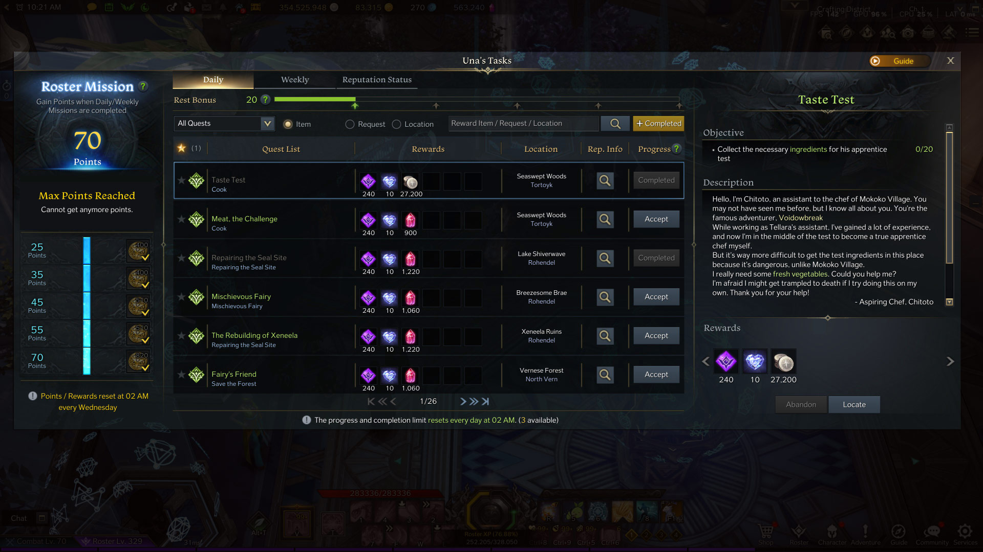 If you miss out on completing a quest, you'll get Rest Bonus points for each quest you miss. You get 10 points per daily quest. You can have a maximum of 100 points. You can spend 20 points to double your rewards for the next quest you participate in. [Tip! An efficient way to use you Rest Bonus points is to skip two days of Una’s Tasks and complete three on the 3rd day OR complete one quest per day with the Rest Bonus applied.]